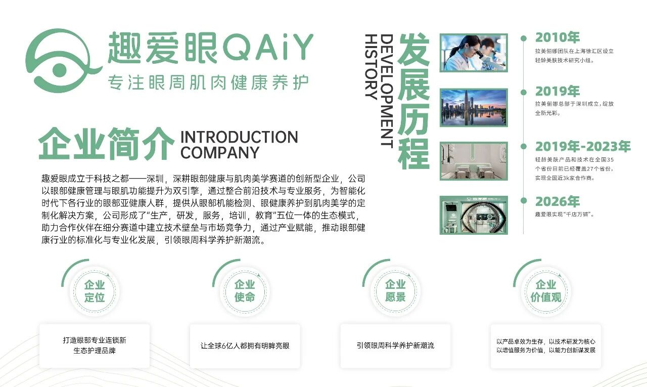 趣爱眼成立于科技之都——深圳,深耕眼部健康与肌肉美学赛道的创新型企业,公司以眼部健康管理与眼肌功能提升为双引擎,通过整合前沿技术与专业服务,为智能化时代下各行业的眼部亚健康人群,提供从眼部机能检测、眼健康养护到肌肉美学的定制化解决方案,公司形成了“生产,研发,服务,培训,教育”五位一体的生态模式,助力合作伙伴在细分赛道中建立技术壁垒与市场竞争力,通过产业赋能,推动眼部健康行业的标准化与专业化发展,引领眼周科学养护新潮流。